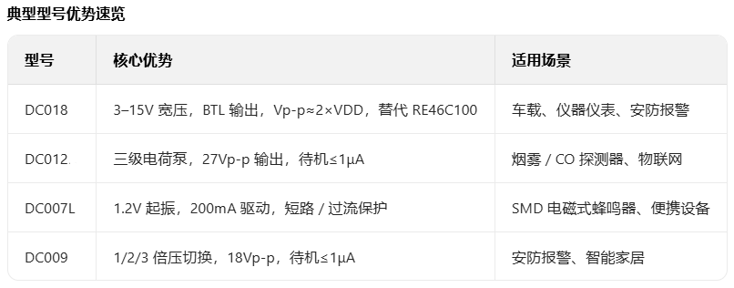 內(nèi)置多級(jí)電荷泵 / H 橋,壓電驅(qū)動(dòng)電壓 Vp-p 可達(dá)電源電壓 2 倍甚至更高(如 DC012N 達(dá) 27Vp-p、DC009 達(dá) 18Vp-p),3V 供電即可輸出高聲壓(如 85dB+),滿足安防 / 報(bào)警等高聲壓需求。